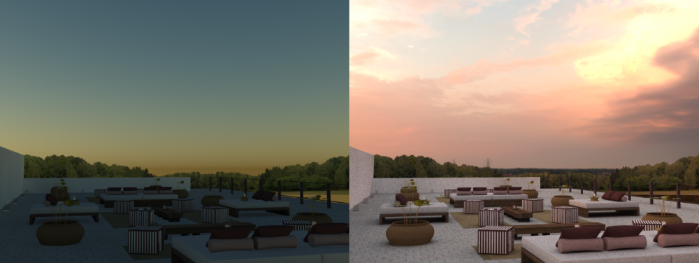 イメージベース照明では、画像上の太陽の位置がHDRIレンダリングに反映します。 画像にある光源から光を放射していると考えます。 HDRI照明がオンの場合、SketchUpの日付/時刻設定は反映されません。