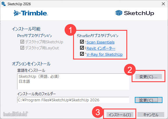 ①の3つの機能は評価版ライセンス及びSketchUp Studioのサブスクリプションライセンスをお持ちの方が使用できる機能です。
