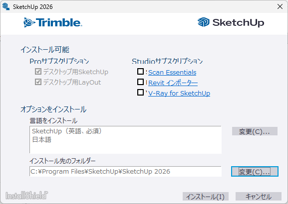 SketchUp Proの機能のみをお試し頂く場合は、下図のように各項目のチェックを外した状態にして下さい。
