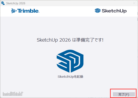 インストールが完了すると下図の表示になります。「完了」で閉じてください。※中央の SketchUp のアイコンをクリックすると SketchUp が起動します。