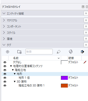 インポートした地形データにはタグが付与され、タグフォルダ:『地理的位置情報コンテンツ』が追加されています。