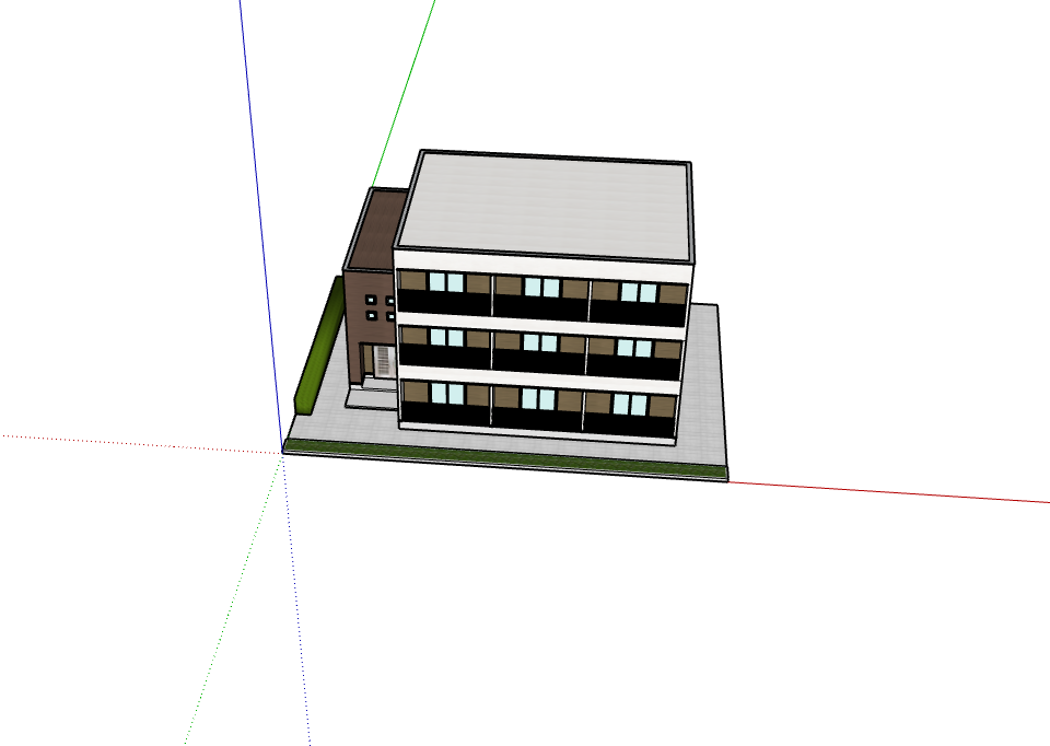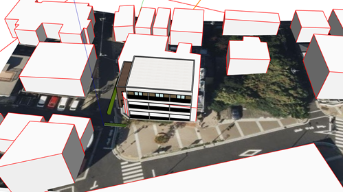 下図のようにSketchUpファイル内に周囲の地形データ(情報)と簡易的な3Dモデルがインポートされました。