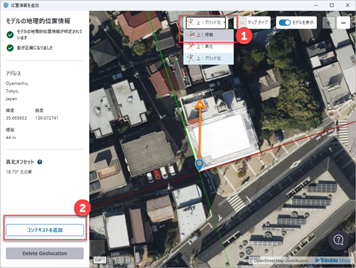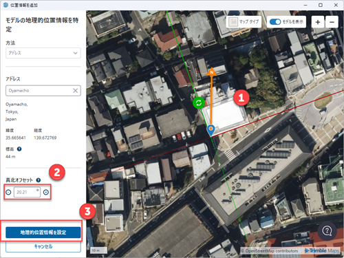 SketchUp では「位置情報の追加」機能を使用するとモデルに緯度経度の情報が追加され、衛星画像や地形、周辺建物の簡易モデルを取り込むことができます。