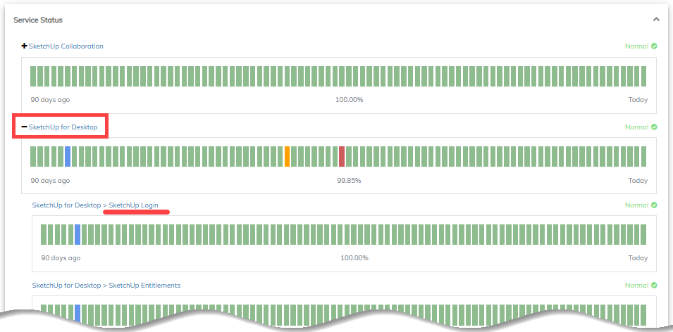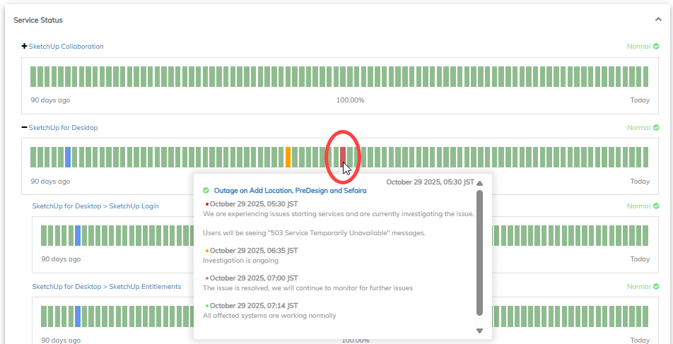 以下ページが表示されます。このページでは過去90日間でSketchUpやその他の関連サービスにシステム障害が起きていたかを確認できます。