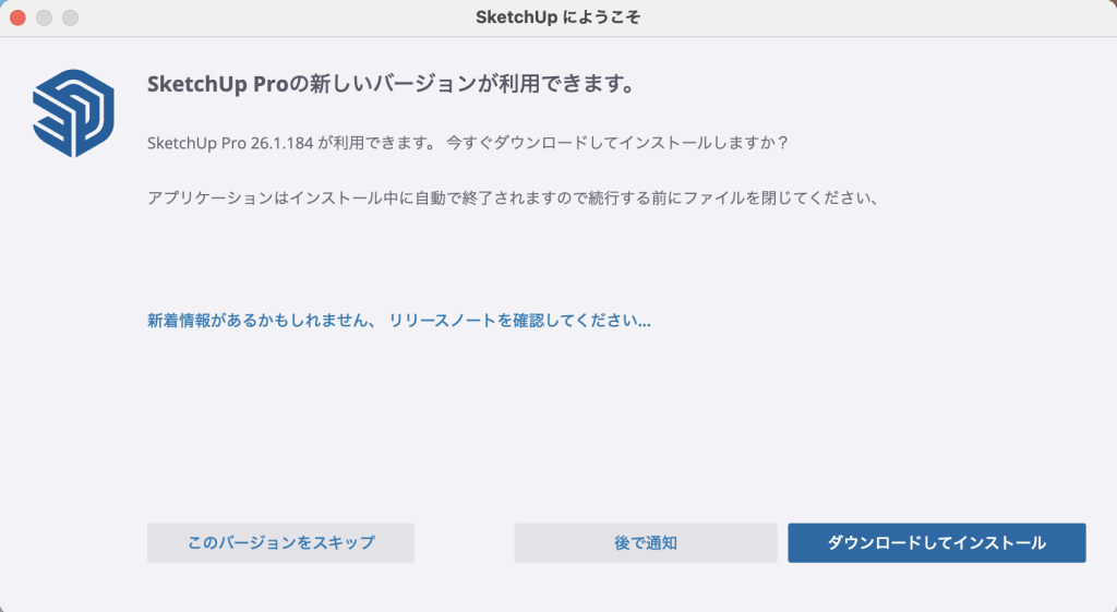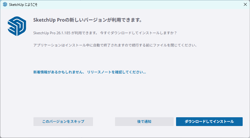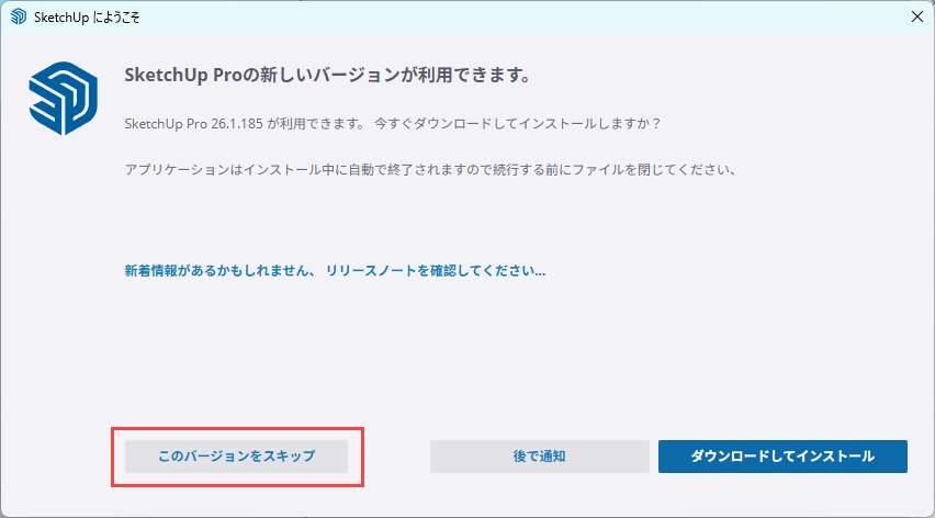 SketchUp2026を起動後、メッセージが表示されたがバージョンアップを後回しにしたい場合は「このバージョンをスキップ」をクリックしてください。