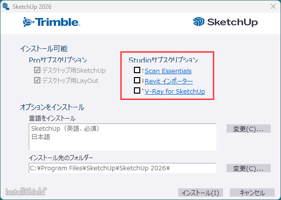 SketchUp Studioの機能を使用する場合は、任意の項目にチェックを入れて下さい。