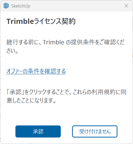 起動後「Trimbleライセンス契約」が表示された場合は、「オファーの条件を確認する」をお読みいただき「承認」をクリックして起動が可能です。