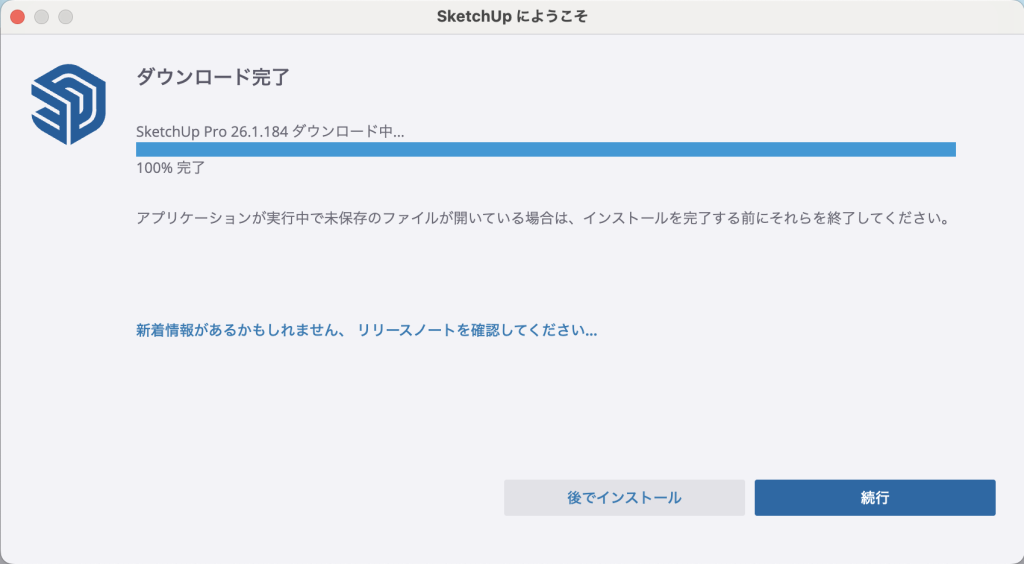 ※SketchUp2026を起動して、メッセージが表示される場合もあります。その際は以下の手順に従ってください。