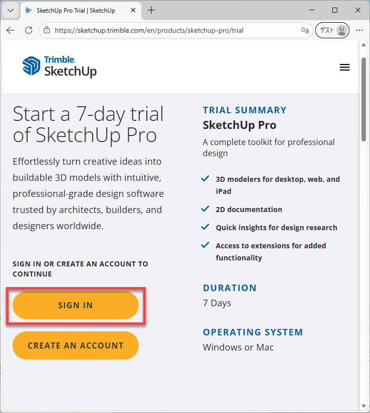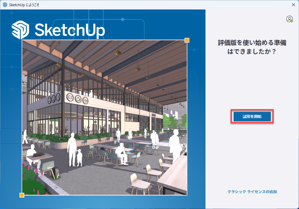 上記の手順によりSketchUpの評価版がご利用できるかご確認をお願いします。
