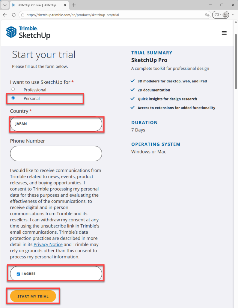 現在SketchUpにて「試用を開始」をクリックすると(下図赤枠内)、エラーページが表示され