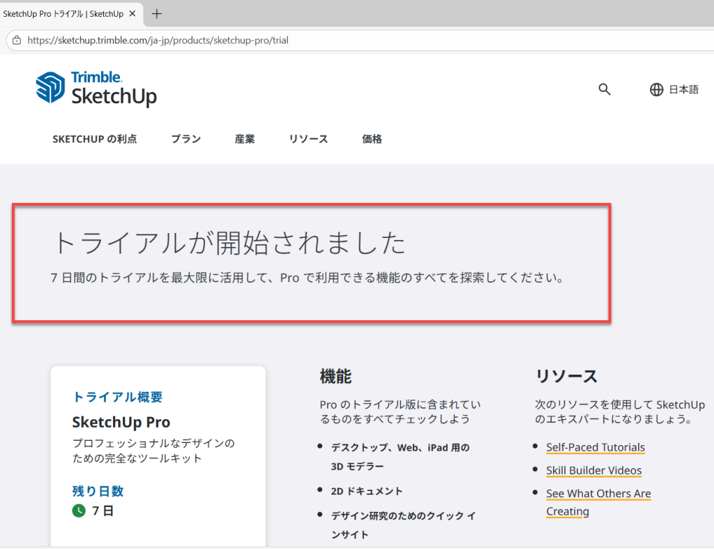 7. 「トライアルが開始されました」の画面が表示されましたらSketchUpの評価版をご利用いただける状態となります。