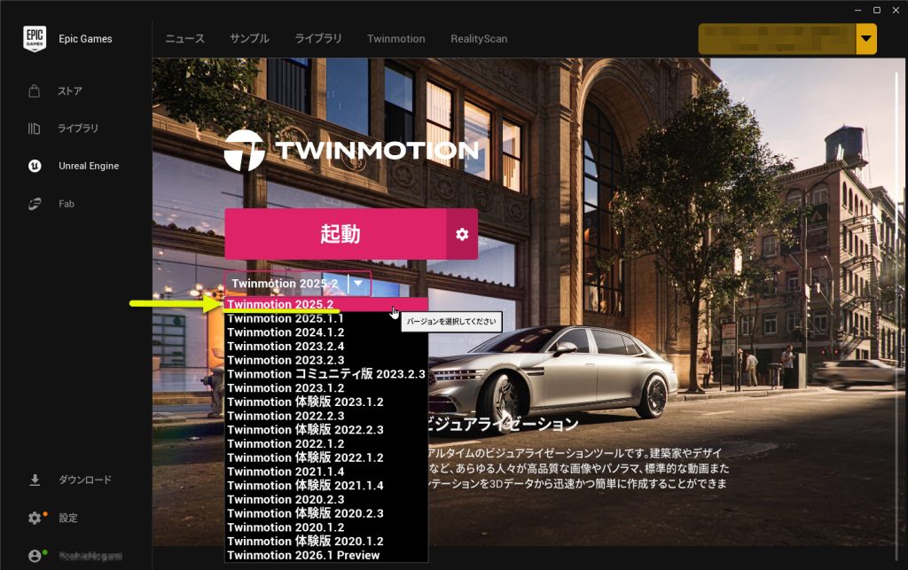 Epic Games Launcherを起動してログインし、ランチャー上部にある「Twinmotion」をクリックすると、以下の画面が表示されます。